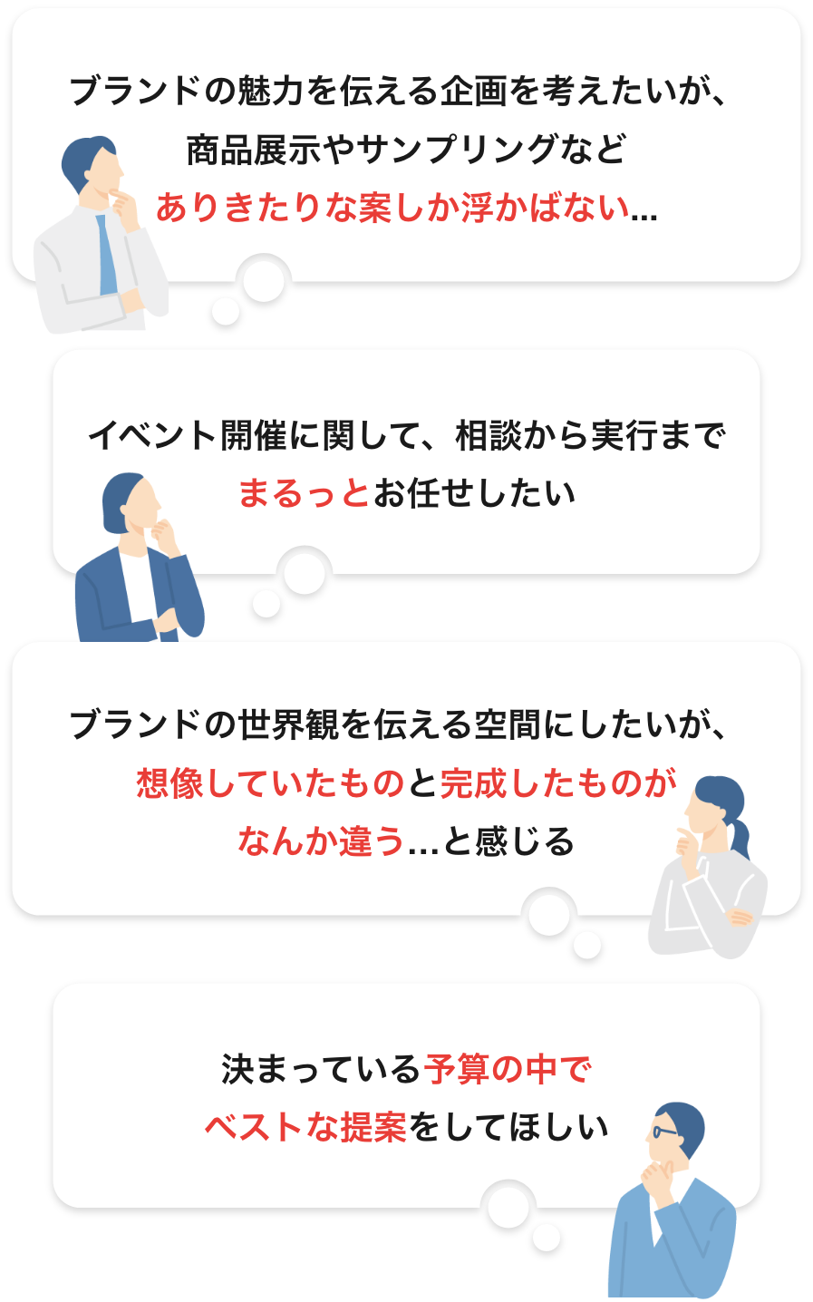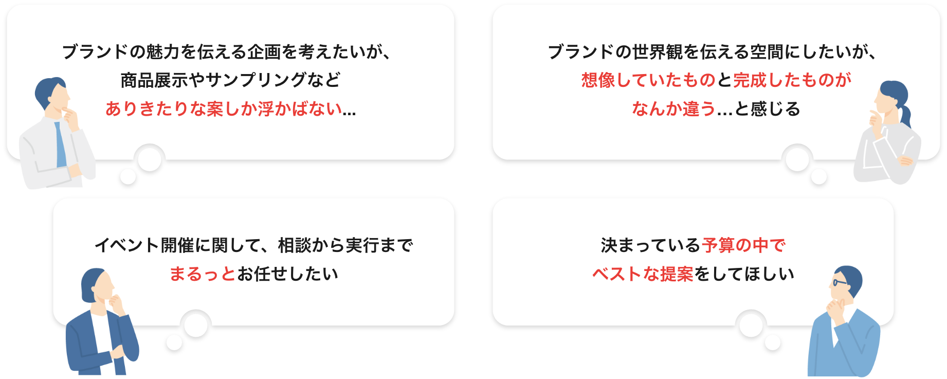 イベントを楽しみながらブランド・商品の「らしさ」や魅力を感じていただくために、会場全体のトンマナや造作物・体験イベント・会場内の配置・導線設計・当日の運営まで、現場を熟知したプロが提案します。