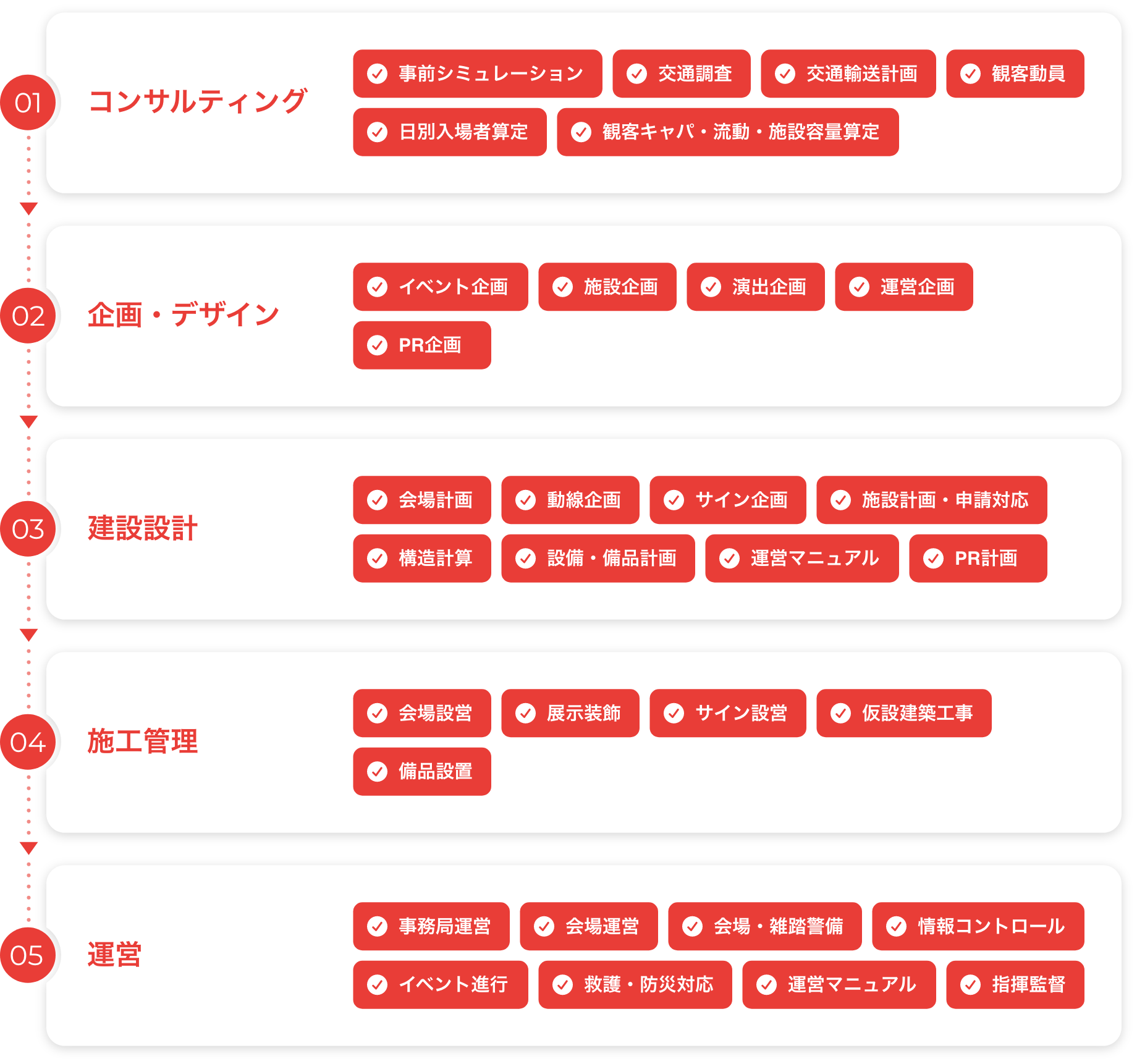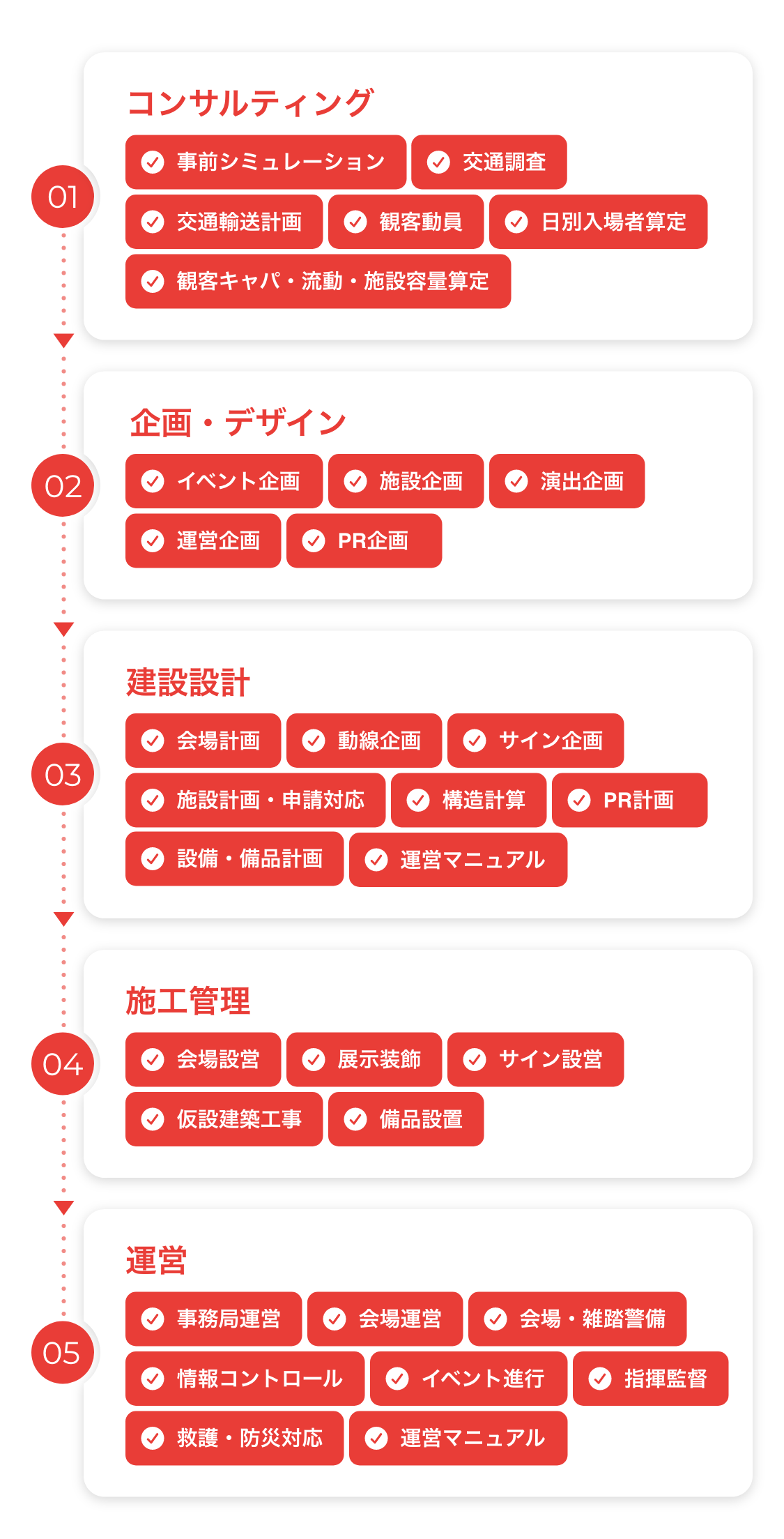 一級建築資格やプライバシーマークなど、法に乗っ取った体制があり、仮設建築物申請・消防署/保健所への申請・タイムスケジュールの作成・現場マニュアルまで、すべてTSP太陽が巻き取ります。